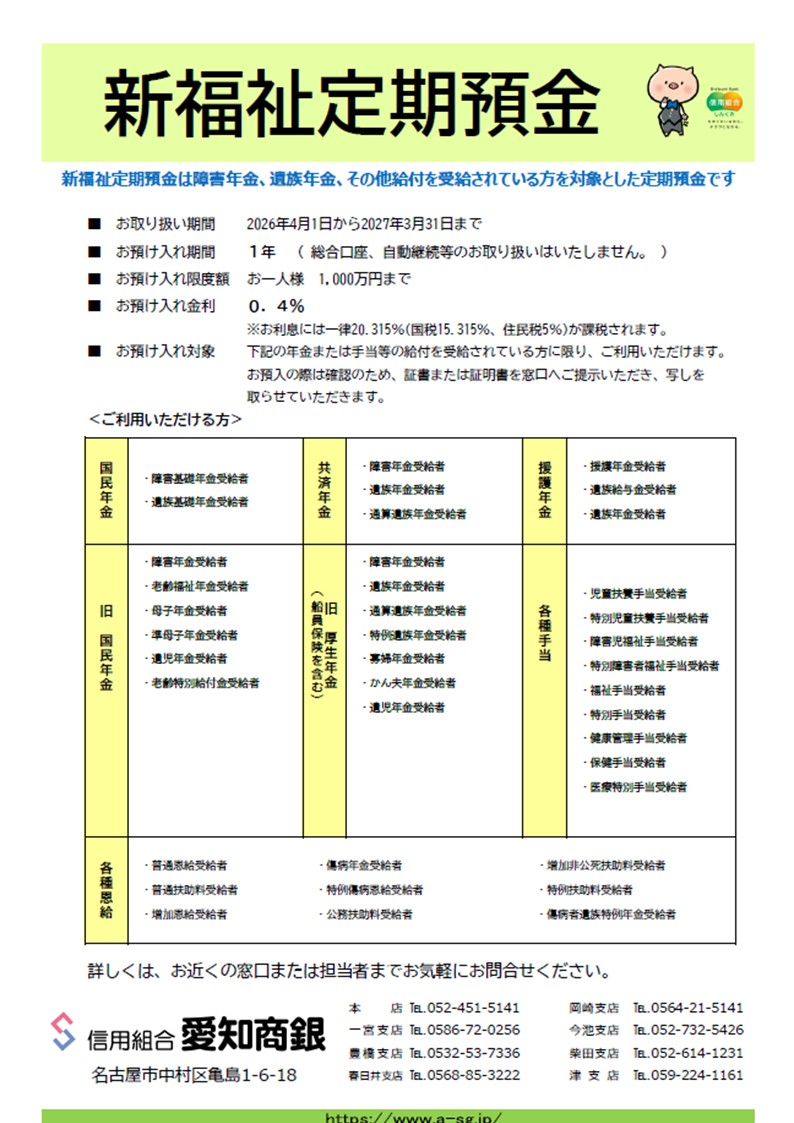 | ご利用いただける方 | 国民年金法または厚生年金保険法に基づく方に支給される公的年金または 各種手当てなどを受給されている個人の方 ※お預入の際は確認のため証書または証明書を窓口にご提示いただきます。 |